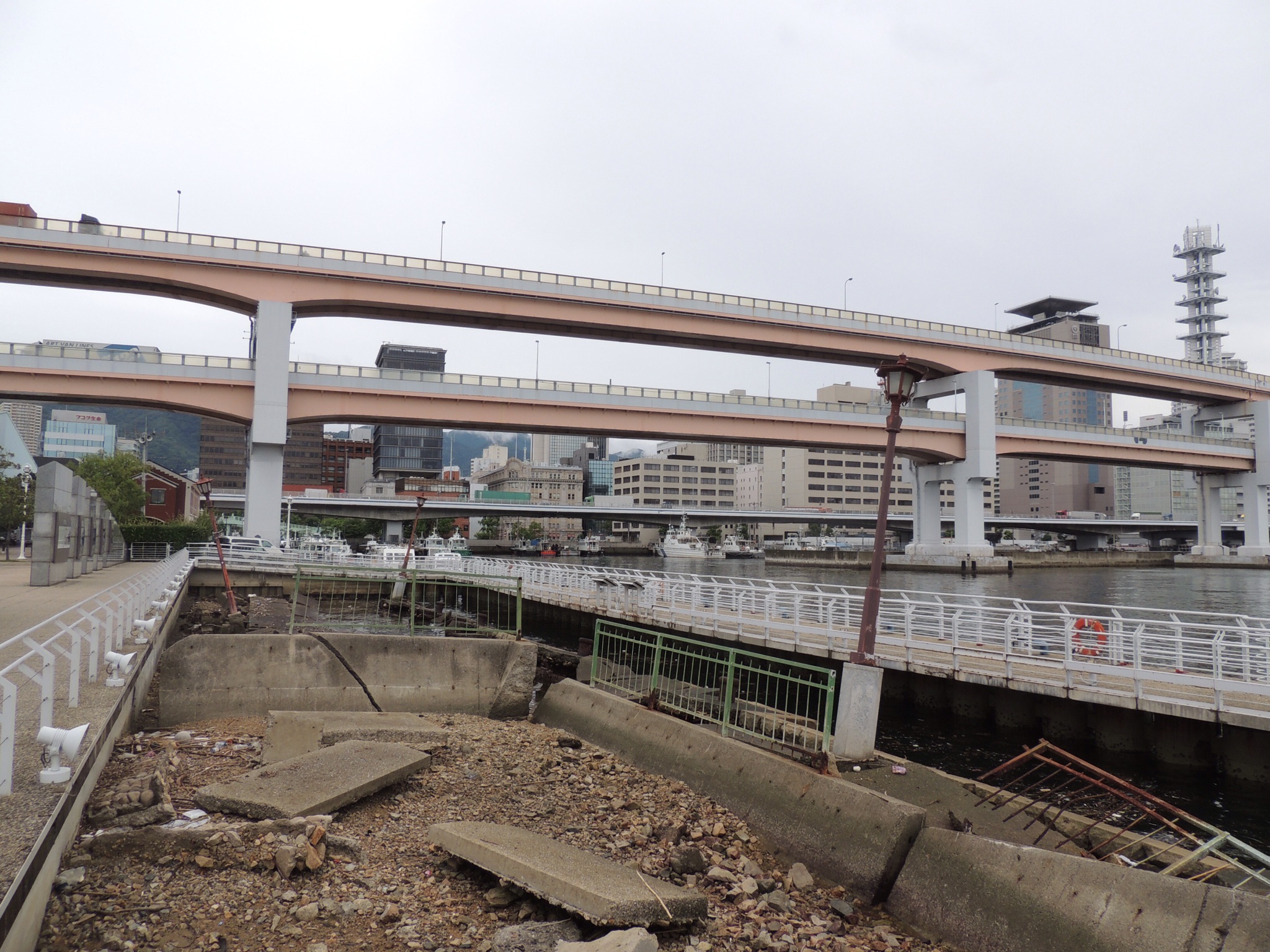 DSCN4085.JPG Weltweite Aufmerksamkeit erhielt Kōbe im Januar 1995 als das gewaltige „Hanshin-Awaji“-Erdbeben über 6.000 Menschen das Leben kostete, ganze Stadteile vollständig zerstört wurden und die Bilder von der eingestürzten doppelstöckigen Stadtautobahn um die Welt gingen. Erst 2004, erreichte Kōbe nach einer massiven Abwanderung von Bewohnern wieder die Einwohnerzahl von 1995. An das Beben erinnert das Memorial am Hafen im Meriken-Park, bei dem die Trümmer unberührt liegen gelassen wurden.